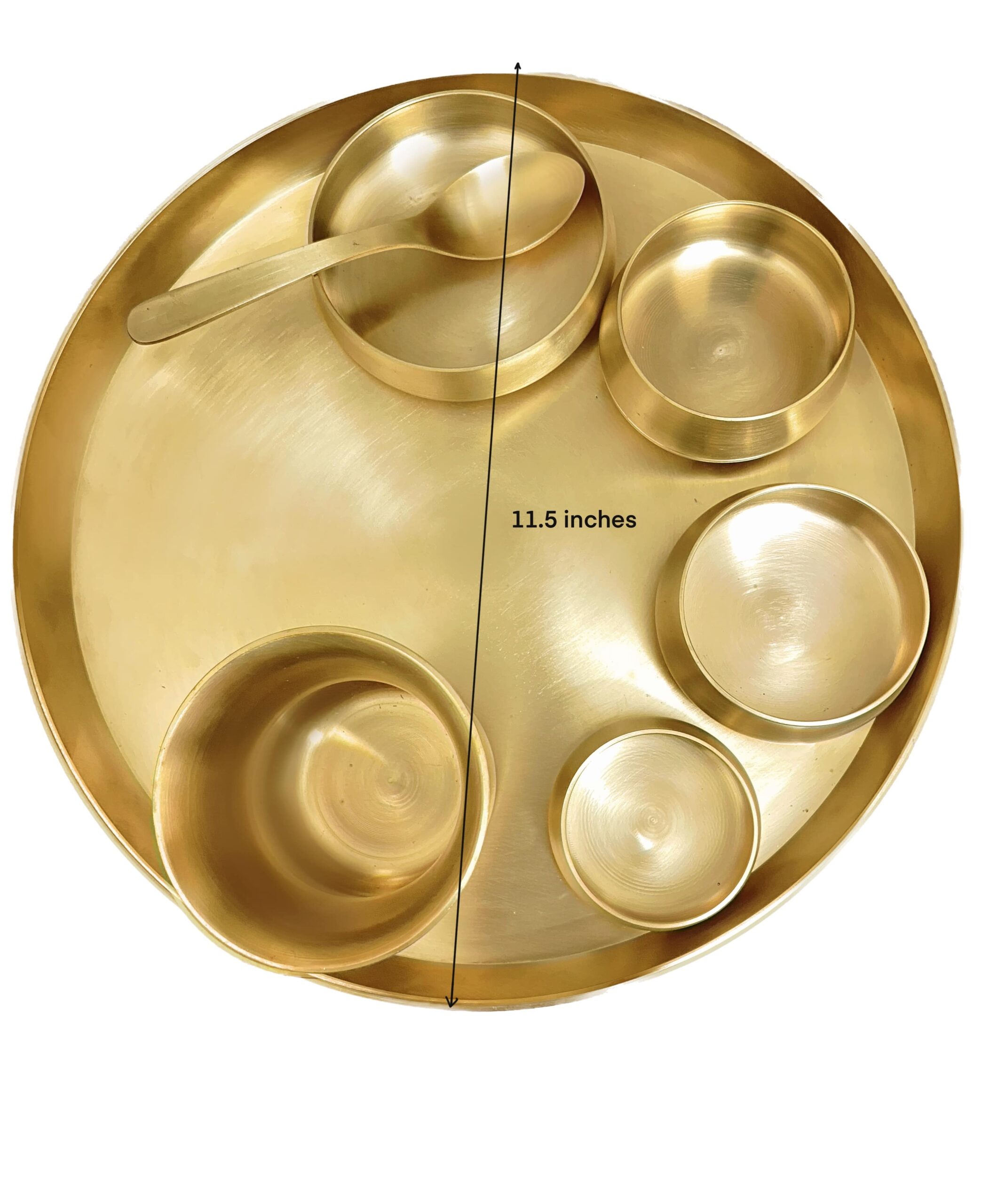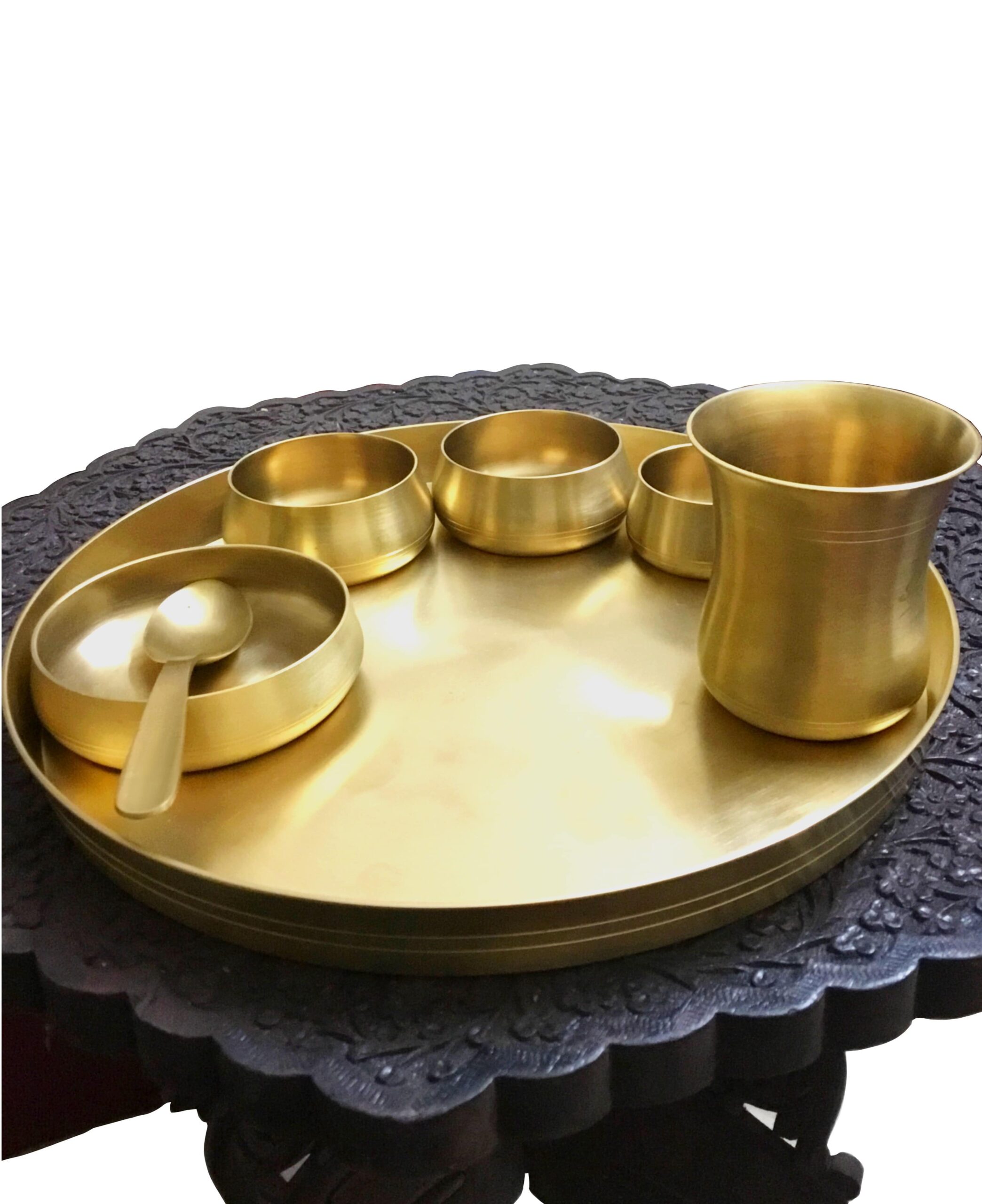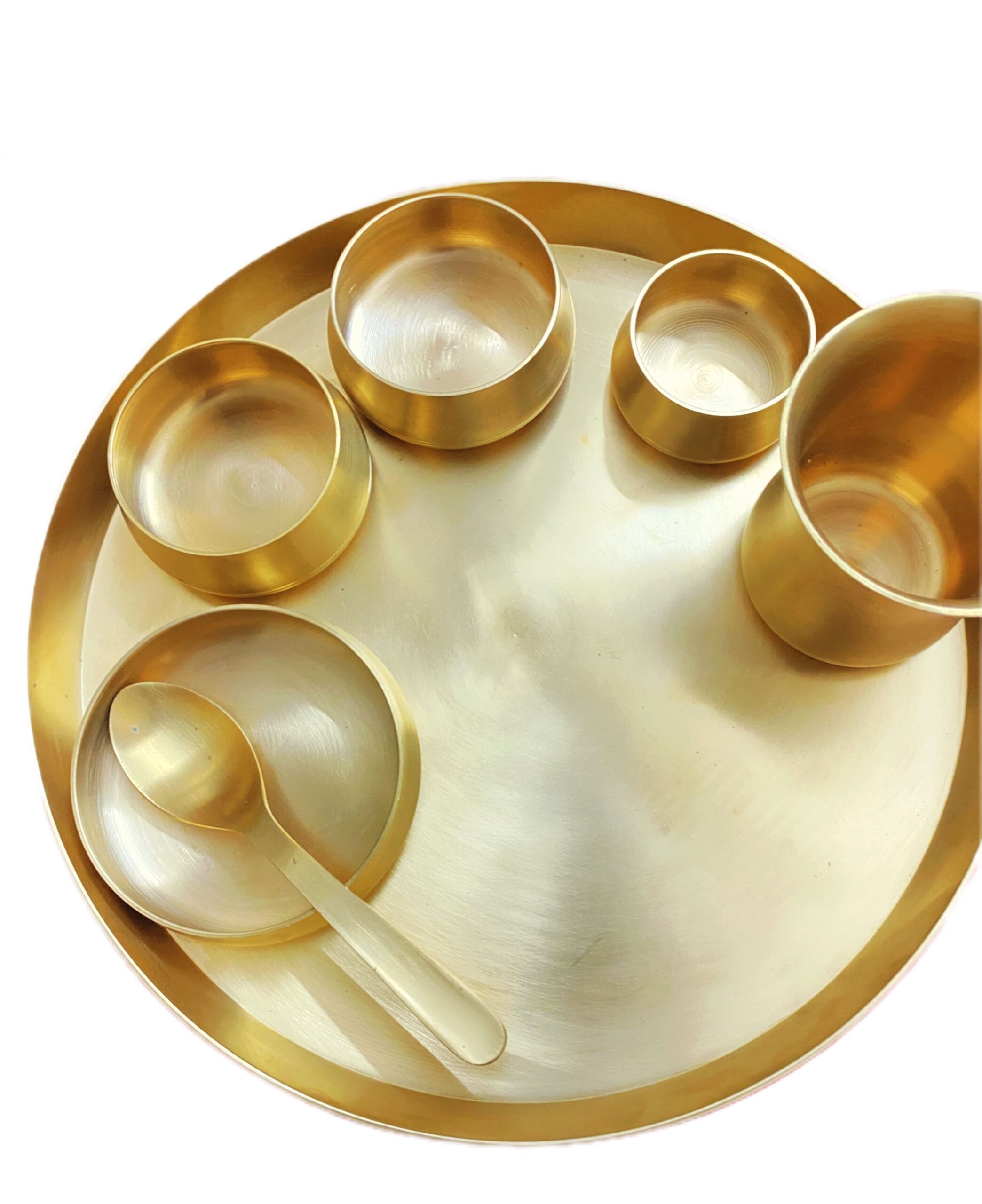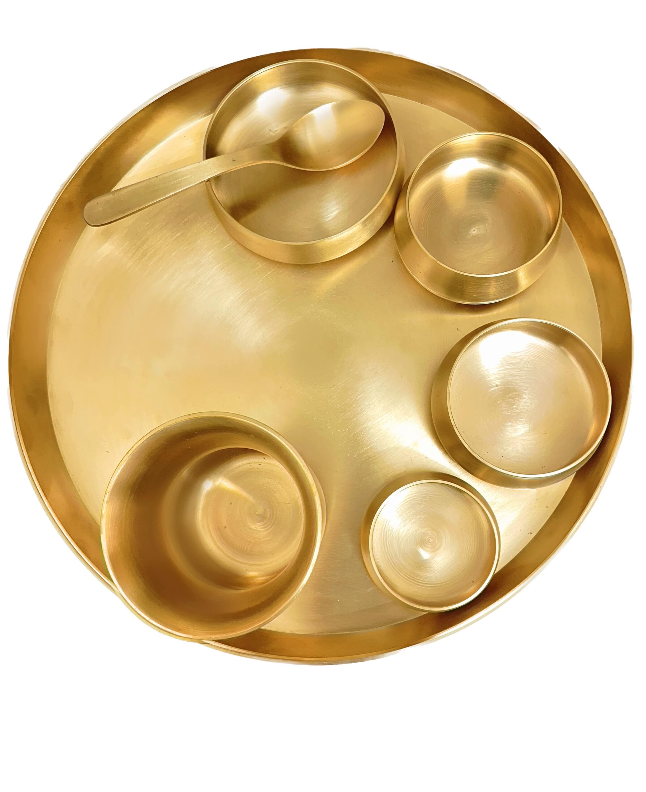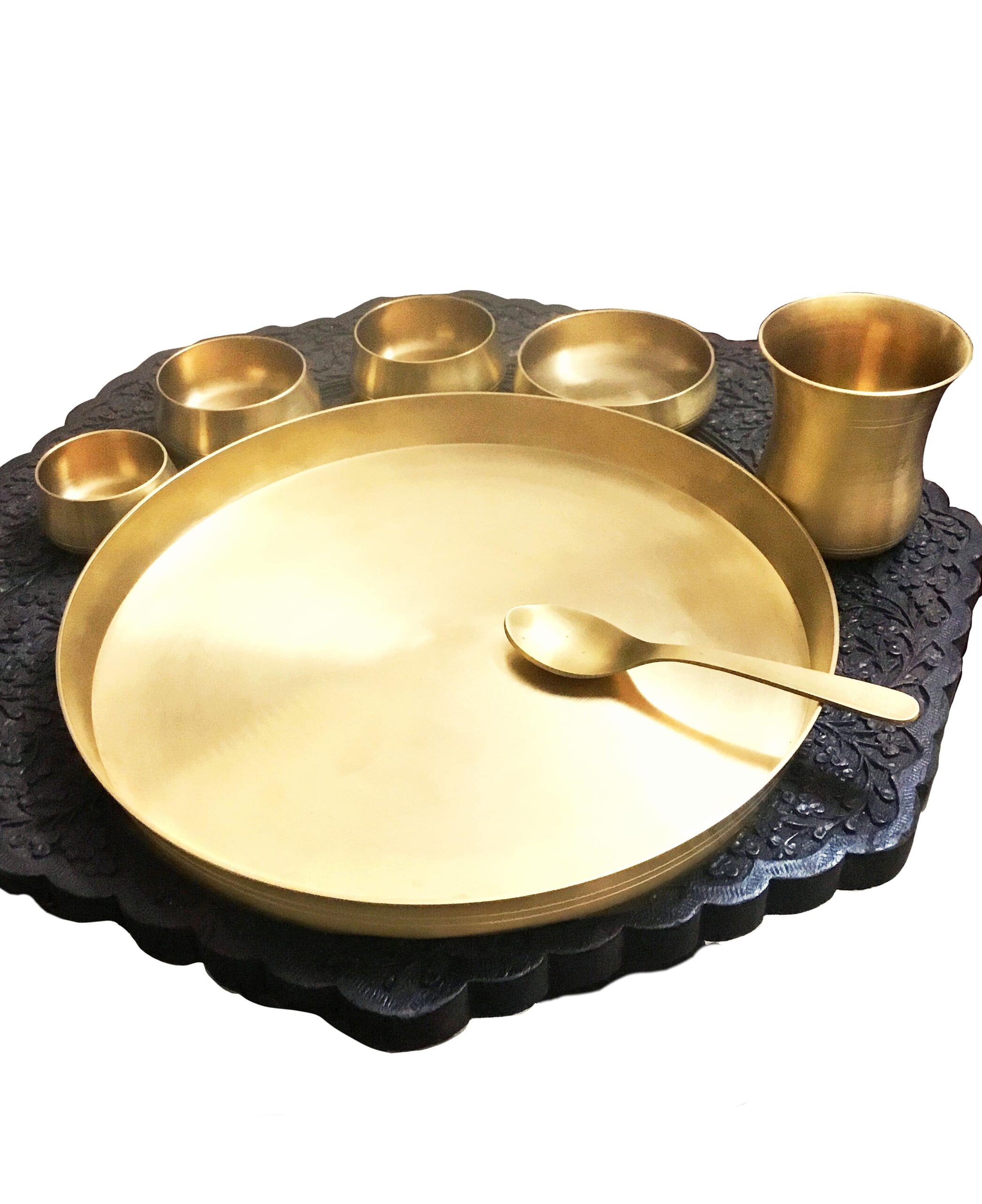 Elevate your dining experience with the Royal Akbar Thali Set – a 7-piece ensemble featuring a captivating matte bronze finish. This meticulously curated collection is more than just dinnerware; it’s a statement of sophistication for your table. Here are detailed measurements: Plate/Thali: 1100 grams, 11.5 inches diameter, 1 inch height Dessert Plate: 170 grams, 150 ml volume, 1 inch height, 4 inches diameter Curved Glass: 185 grams, 300 ml volume, 3.5 inches height, 3 inches width Medium Bowl: 150 grams, 150 ml volume, 1.3 inches height, 3.5 inches diameter Small Bowl: 70 grams, 75 ml volume, 1.2 inches height, 2.5 inches diameter Spoon: 40 grams, 6 inches height, 1.3 inches width Captivating Matte Bronze Finish: Revel in the allure of a plain yet fancy matte bronze finish that adds a touch of luxury to your dining table. Comprehensive Dining Solution: This versatile set includes one large Plate/Thali, one Dessert Plate, two Medium Bowls, one Small Bowl, one Spoon, and one Curved Glass – a complete solution for your dining needs. Sleek and Weighty Construction: Crafted with precision, each piece in the set weighs a total of 1850 grams, providing a substantial and modern feel to your dining experience. Health Benefits of Bronze: Holistic Dining Experience: Beyond its aesthetic appeal, bronze has been known for its holistic benefits. Enjoy the unique advantage of incorporating trace amounts of copper into your diet, which is believed to offer potential health benefits. Durable and Timeless: Made from high-quality bronze, this set is not just about aesthetics – it’s built to last. Enjoy the timeless beauty and durability that our Royal Akbar Thali Set brings to your dining collection. Make a Statement: Transform your dining space with this exquisite 7-piece set. Purchase the Matte Bronze Royal Akbar Thali Set today and redefine the art of dining – where simplicity meets luxury, and health meets style.
